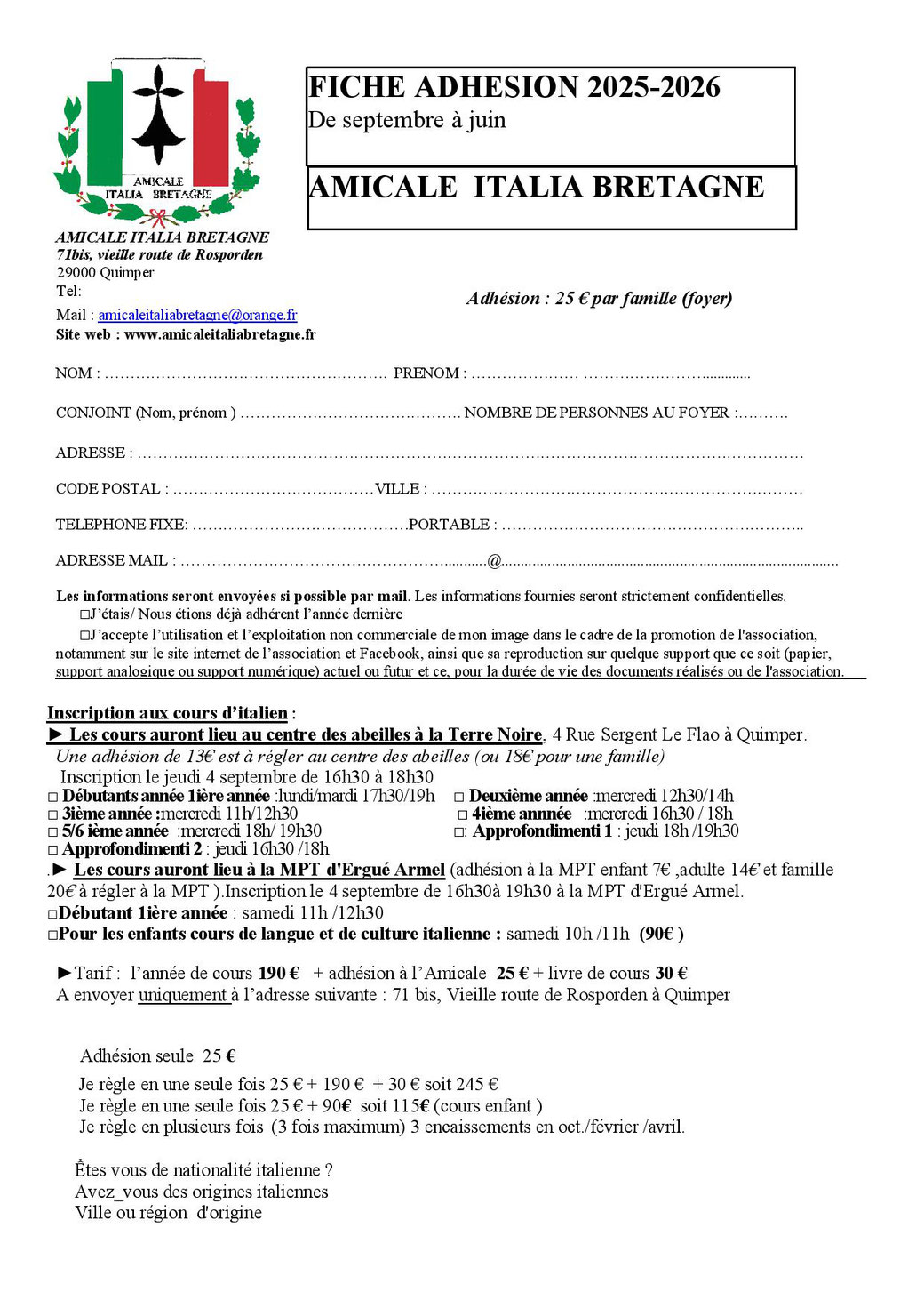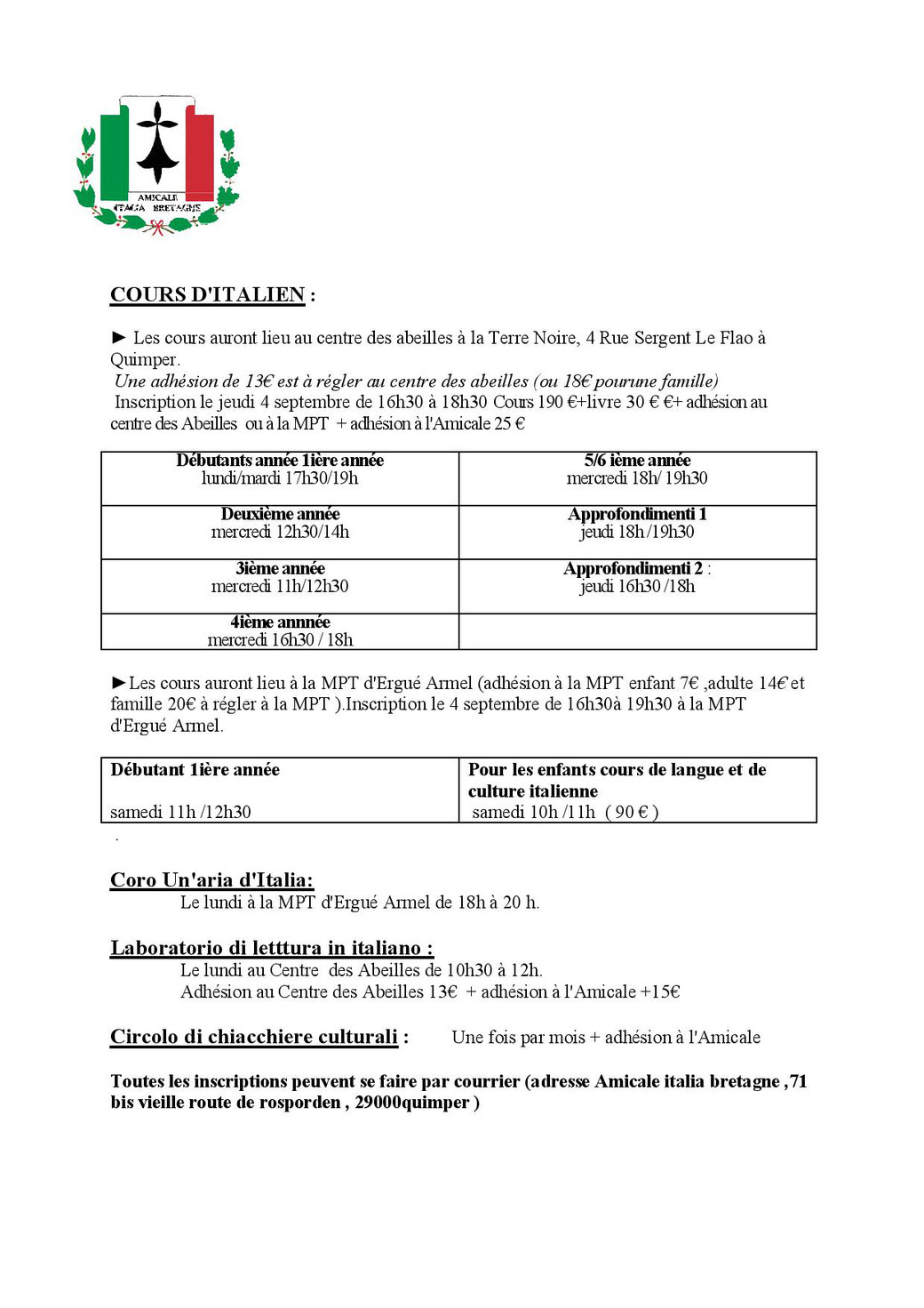 Coordonnées : AMICALE ITALIA BRETAGNE 71 bis vieille route de Rosporden 29000 QUIMPER.